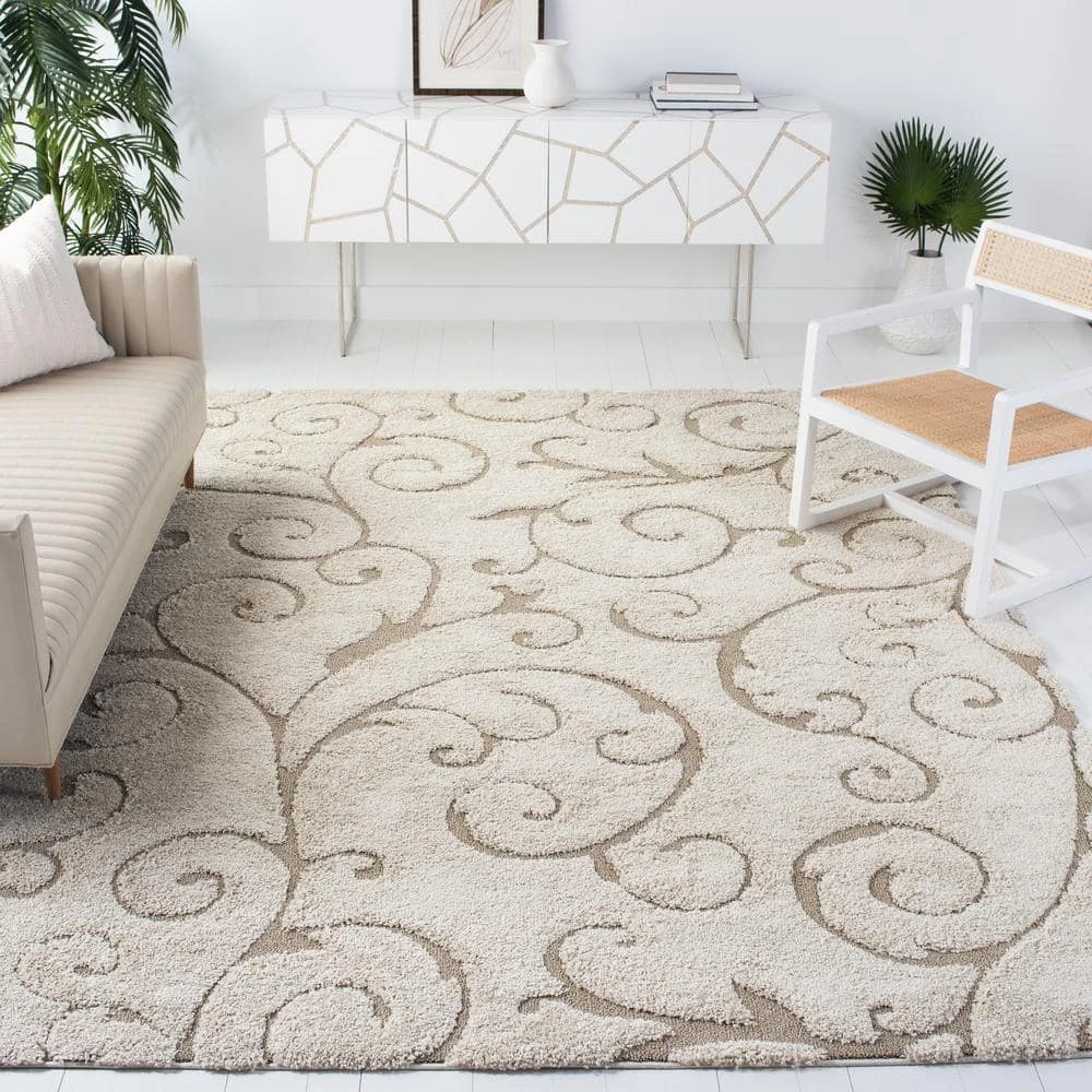 This Safavieh Florida shag captures the laid-back lifestyle of the southern peninsula in an ultra-soft, creme tone-on-tone floor covering. A sculpted high-low pile accentuates the detailed damask vine designs for rich textural dimension. Constructed using power-loomed synthetic yarns for a durable, casual shag carpet that will retains vivid color and striking texture for years to come.