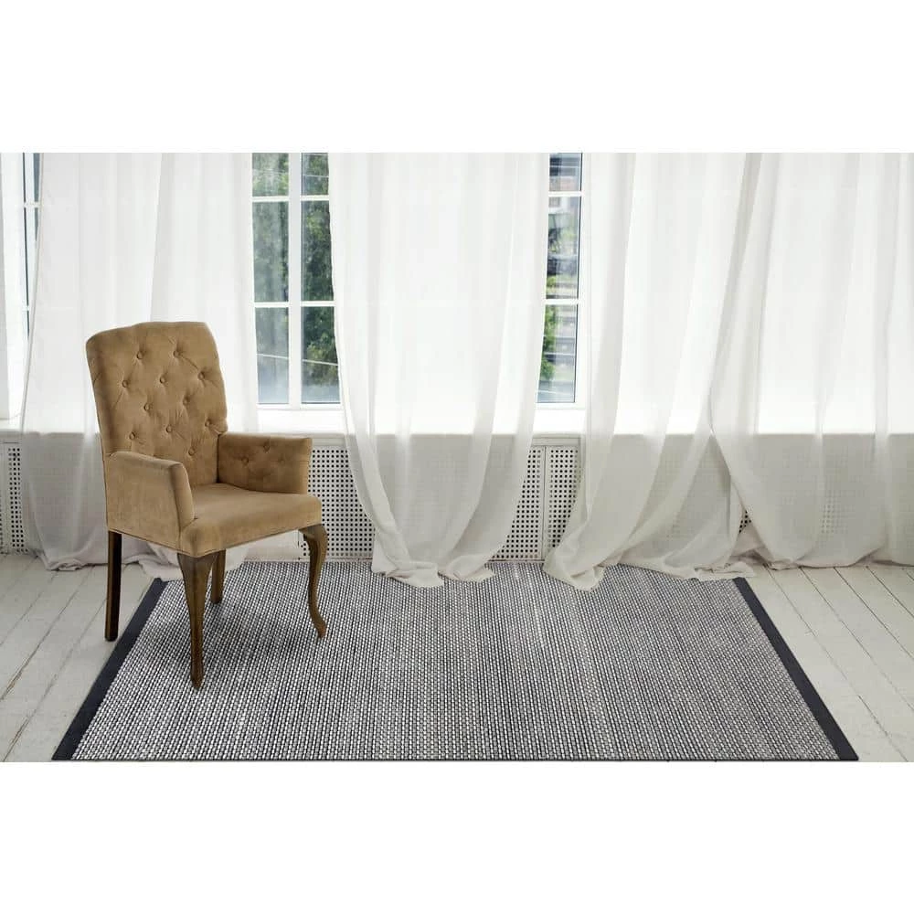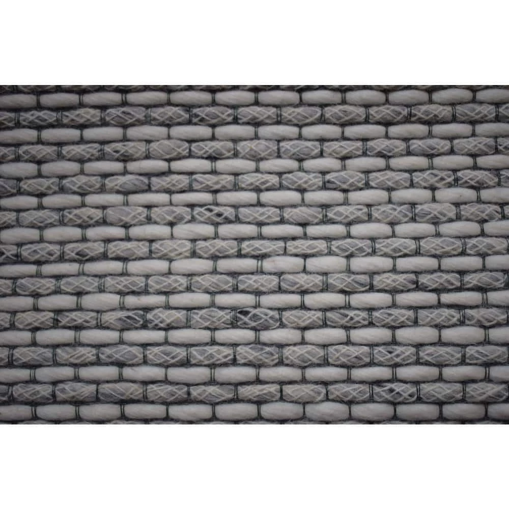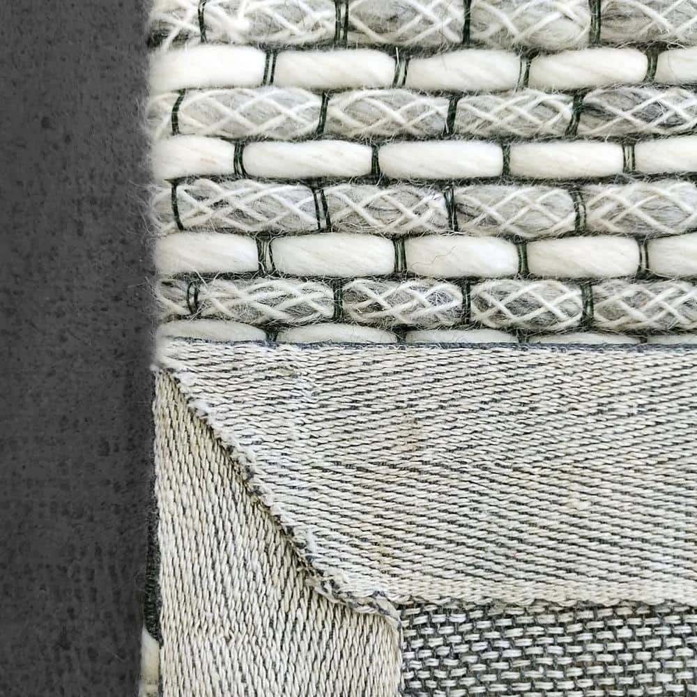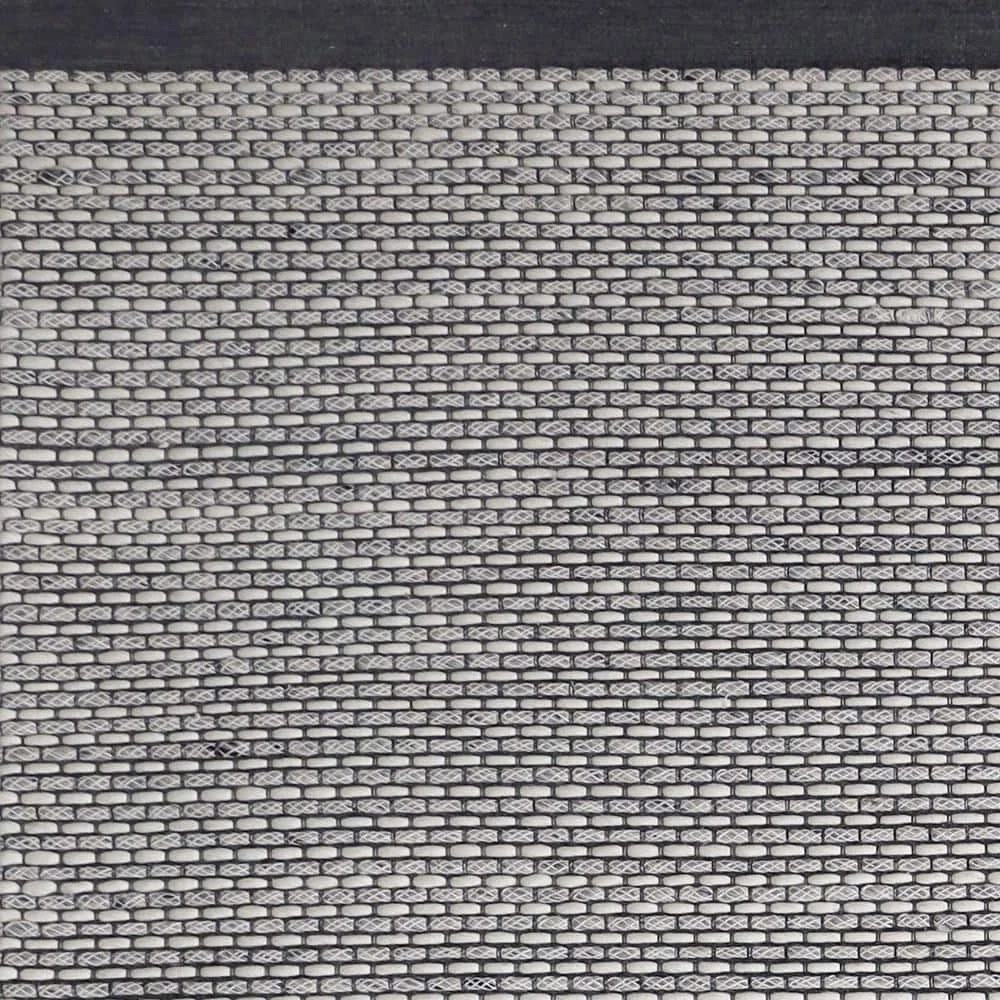 A simple design consisting of small blocks broken apart by careful weaving makes Vici amenable to complement any motif. Interwoven loops with a delicate yarn weaving between create an elegant and unique pebbled texture underfoot. The ivory, black, and grey color palette can complement both a neutral room setting or contrast-in an enlightening way-a colorful room setting. The deep black border on both ends contains Vici in a way that designates it as a statement piece.